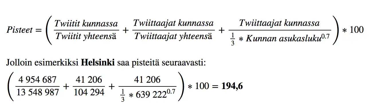 Otetaan seuraavaksi huomioon twiittien lisäksi kunnan asukasluku sekä uniikkien twiittaajien lukumäärä. Kunnan asukasluvun huomioiminen on siinä mielessä hankalaa, että asukasluvultaan pienissä kunnissa matkailijoiden twiitit vaikuttavat suhteettoman paljon. Mitään absoluuttisesti oikeaa vertailutapaa ei ole, mutta Stetson-Harrison -menetelmää soveltamalla päädymme kuitenkin kaavaan, jossa huomioidaan kaikki em. tekijät: